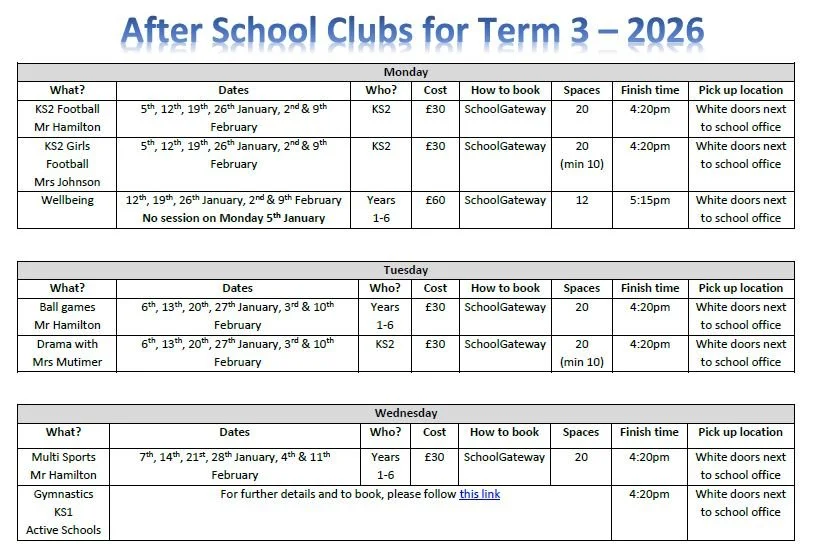 Our clubs are available to book via SchoolGateway approximately two weeks before the end of term for the following term - this will be confirmed via an email to parents during the term. Bookings close at midday on the first day of the following term however spaces may still be available so always check with the office if you have missed the deadline.